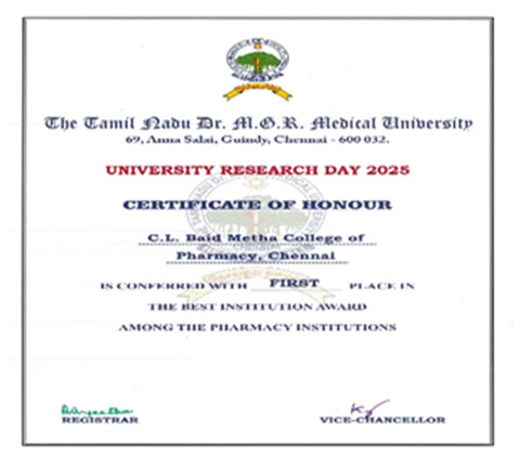 Our college has been conferred with the First Place in the Best Institution Award under the category of Pharmacy Institutions at the University Research Day 2025, organized by The Tamil Nadu Dr. M.G.R. Medical University, Chennai.