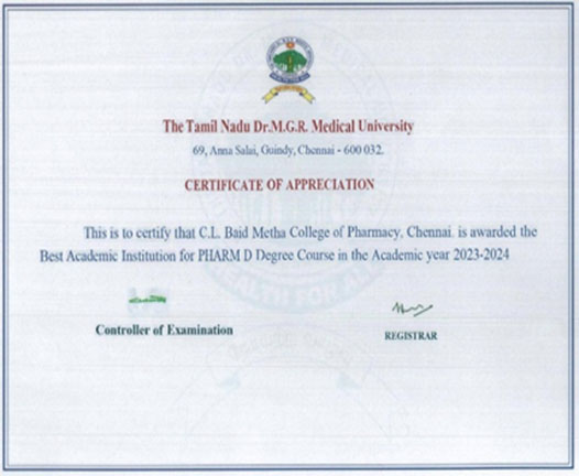 • Sowndharya S was awarded the Pharm.D Gold Medal for the 2020–2026 academic batch by The Tamil Nadu Dr. M.G.R. Medical University.